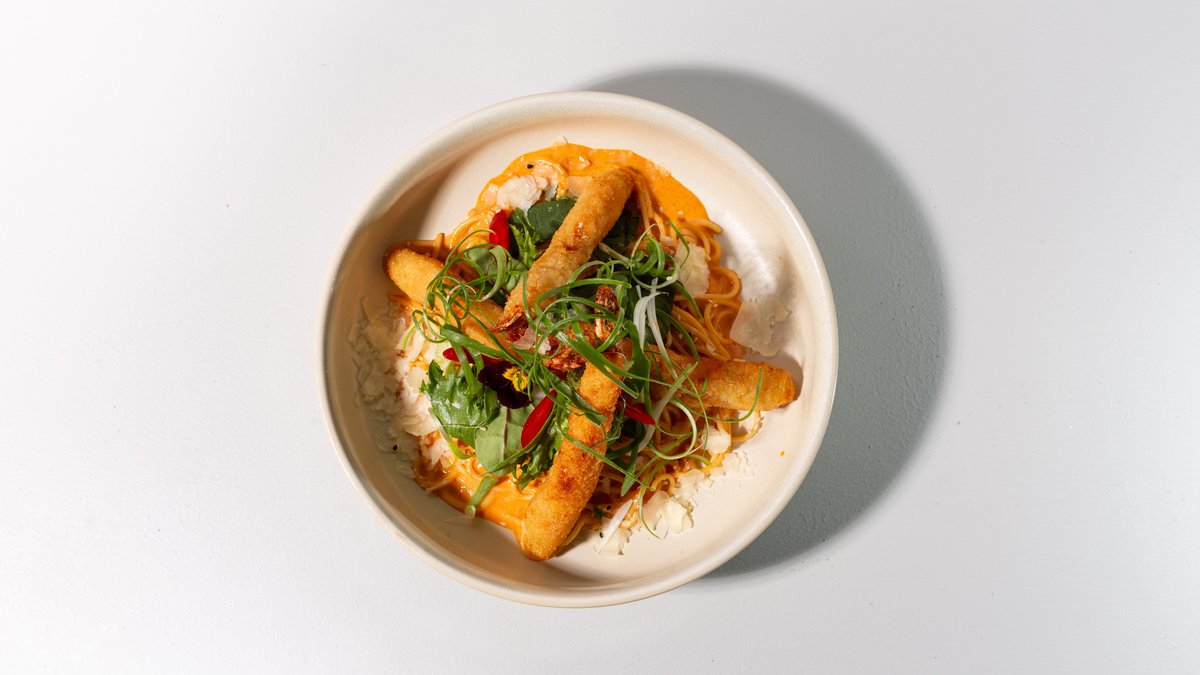 cremige Gochujang Spaghetti mit Parmesan, Grana Padano, Wildkräutersalat, knusprige Garnelen, Frühlingszwiebeln