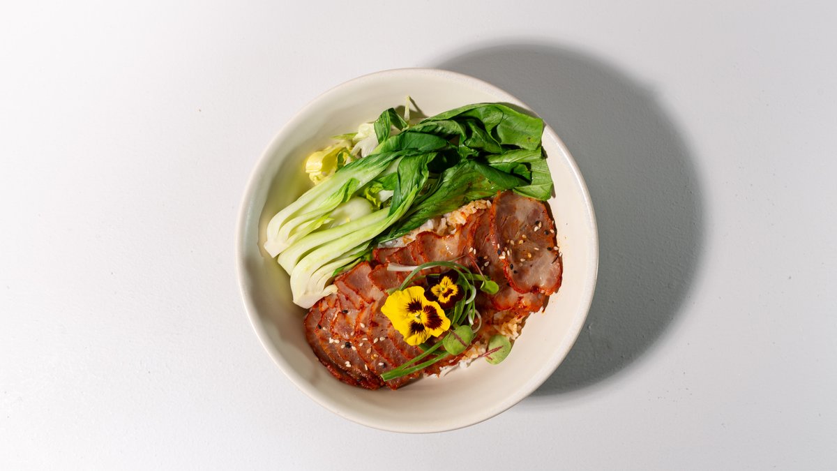 Jasminreis mit geröstetem Xa Xiu-Schweinefleisch, blanchiertem Pak Choi, Soja-Honig-Soße und Sesam