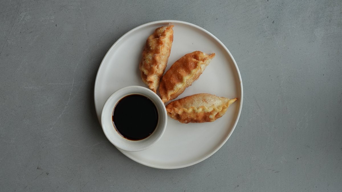 Frittierte Kimchi-Dumplings, serviert mit süßer Sojasauce