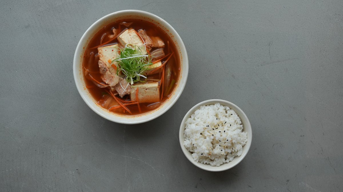 Kimchi-Eintopf mit Zwiebeln & Frühlingszwiebeln, serviert mit Reis & Sesam