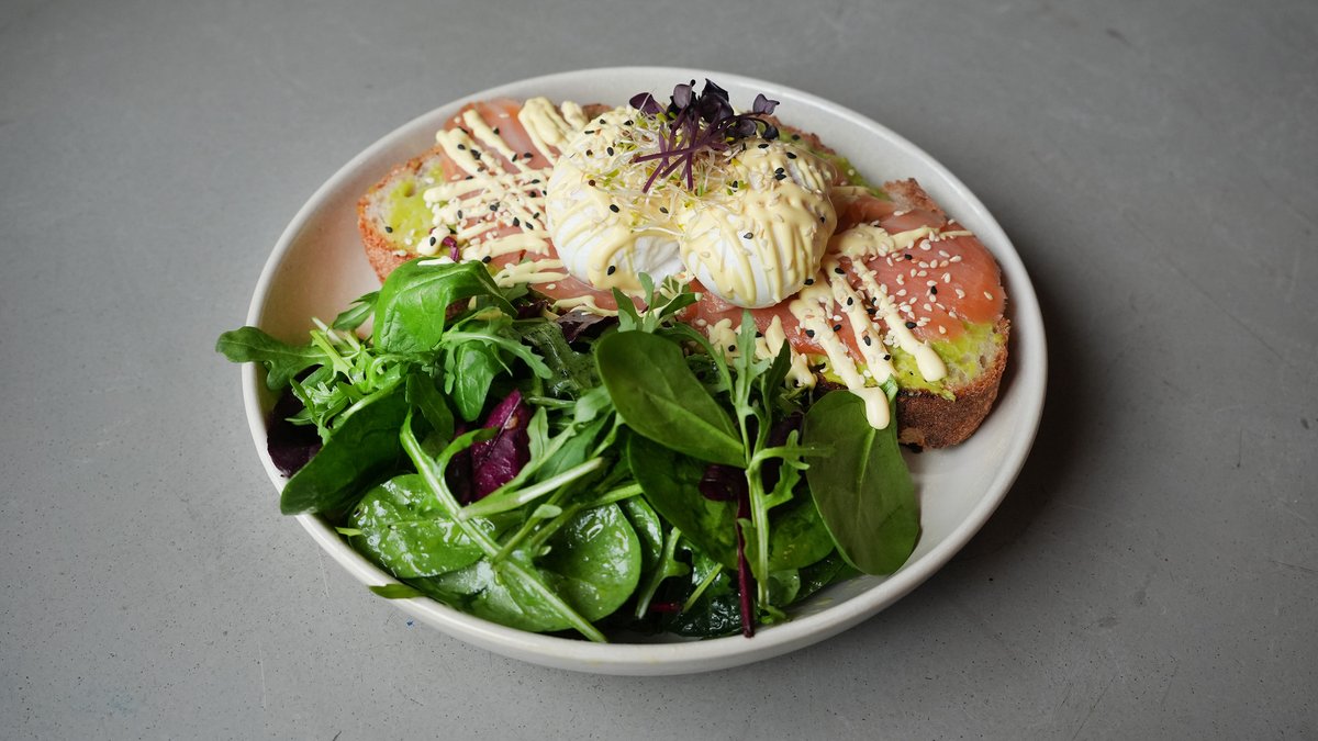 Sauerteigbrot mit Guacamole, Räucherlachs, pochierte Eier, Hollondaise-Sauce, Kresse, Sprossen, Sesam, Wildkräutersalat, Passionsfrucht-Vinaigrette