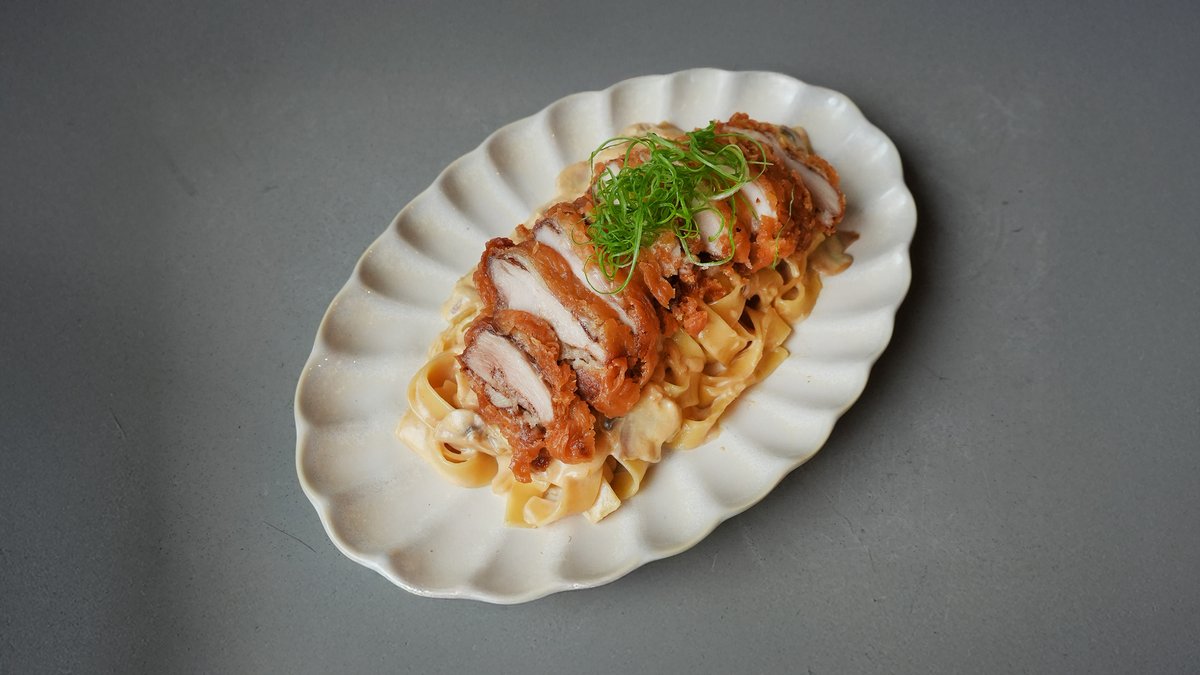 cremige Miso-Champignon Fettuccine mit Parmesan, gewürzte Seetangflocken, knusprige Fünf-Gewürze-Hähnchenschenkel ohne Knochen, Frühlingszwiebeln