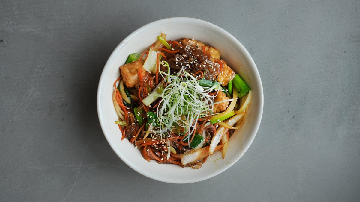 Glasnudeln gebraten mit Zwiebeln, Frühlingszwiebeln, Karotte, Sesamöl & Sesam auf Reis