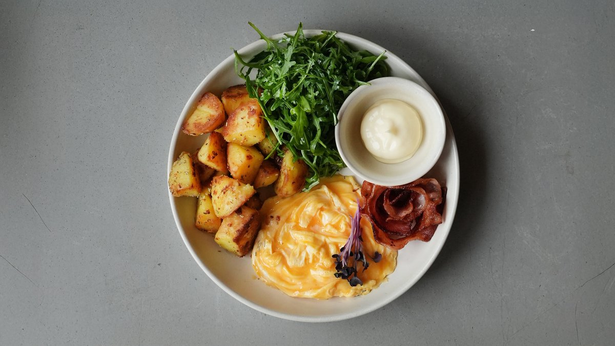 gefaltetes Ei mit Kresse, knuspriger Bacon, Rosmarin-Knoblauch-Bratkartoffeln, Senf-Aioli, Rucola, Passionsfrucht-Vinaigrette
