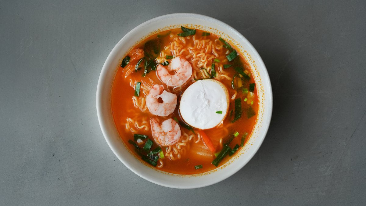 Koreanisches Ramen mit Reiskuchen, Kimchi, Sojasprossen, Karotte & Frühlingszwiebeln
