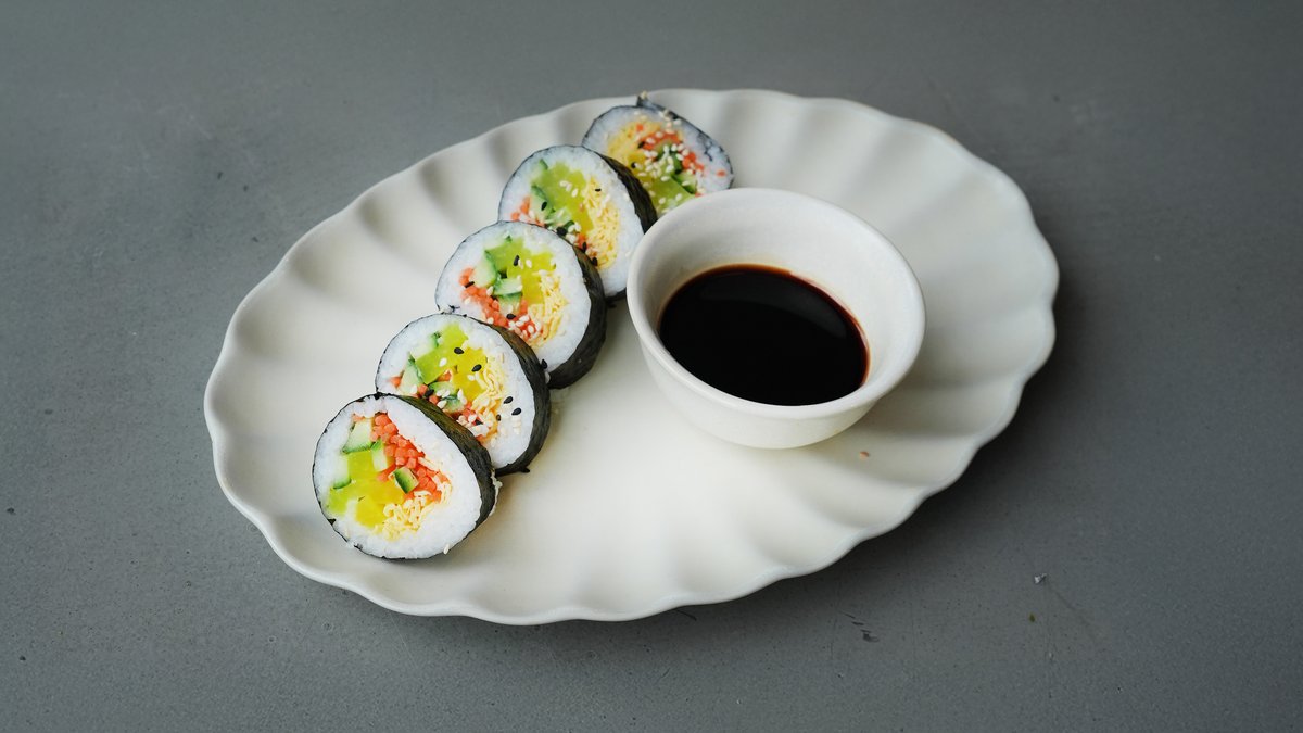 Seetang-Reisrolle mit gelbem eingelegtem Rettich, Gurke, Karotte, Omelett, Sesamöl & Sesam, serviert mit süßer Sojasauce