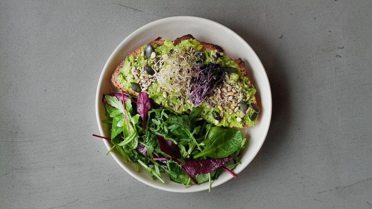 Sauerteigbrot mit zerdrückte Avocado, Körner-Mix, Kresse, Sprosse, Everything Bagel Gewürz, Wildkräutersalat, Passionsfrucht-Vinaigrette, Limette
