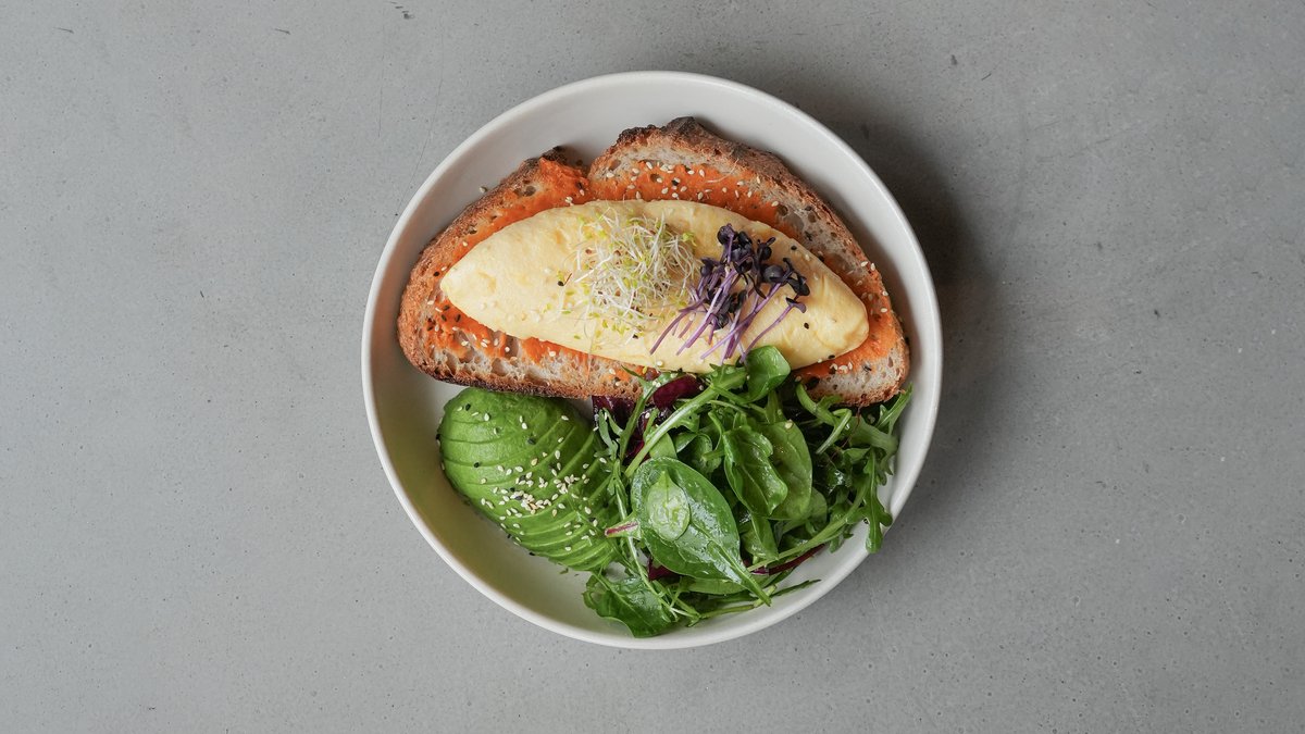 Sauerteigbrot mit Gochuajang-Butter, Omelett, Kresse, Sprossen, Avocado, Sesam, Wildkräutersalat, Passionsfrucht-Vinaigrette