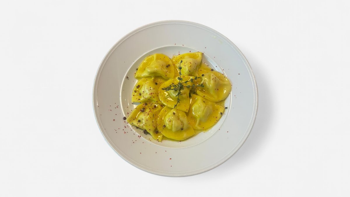 Ravioli al basilico ripieni di orata serviti con burro, zafferano e pepe rosa
