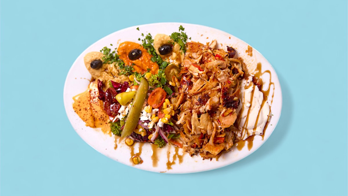 mit Hähnchenfleisch, Kalbfleisch, Köfte, Hummus, Couscous, Ajvar, Metabel, Halloumi, Makali, Falafel und Weinblättern