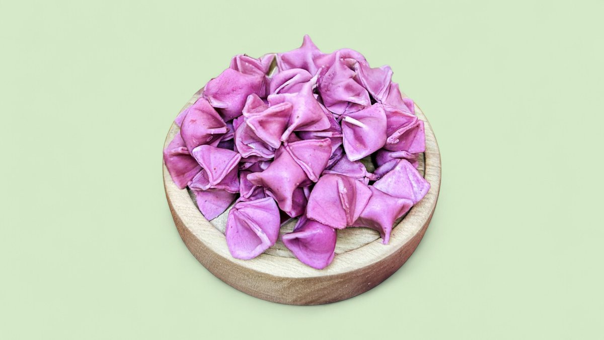 Hausgemachte Manti mit Rote-Bete-Teig und cremiger Käsefüllung – serviert mit Knoblauchjoghurt, heißer Butter und einem Hauch Minze.