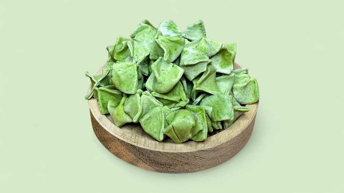 Hausgemachte Pasta mit Sahne, frischem Basilikum-Pesto, Grana Padano, Petersilie und Baby-Blattspinat.