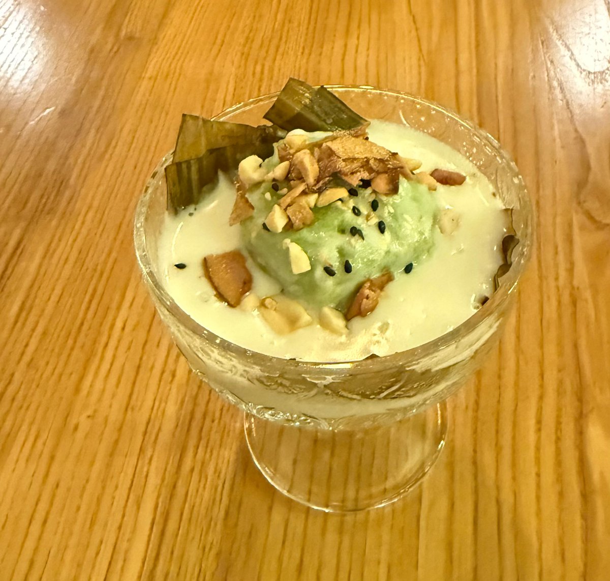 lauwarmer aromatischer vietnamesischer "Honigwabe" Kuchen mit Pandan-Gewürzblättern, Erdnüssen und Kokossoße