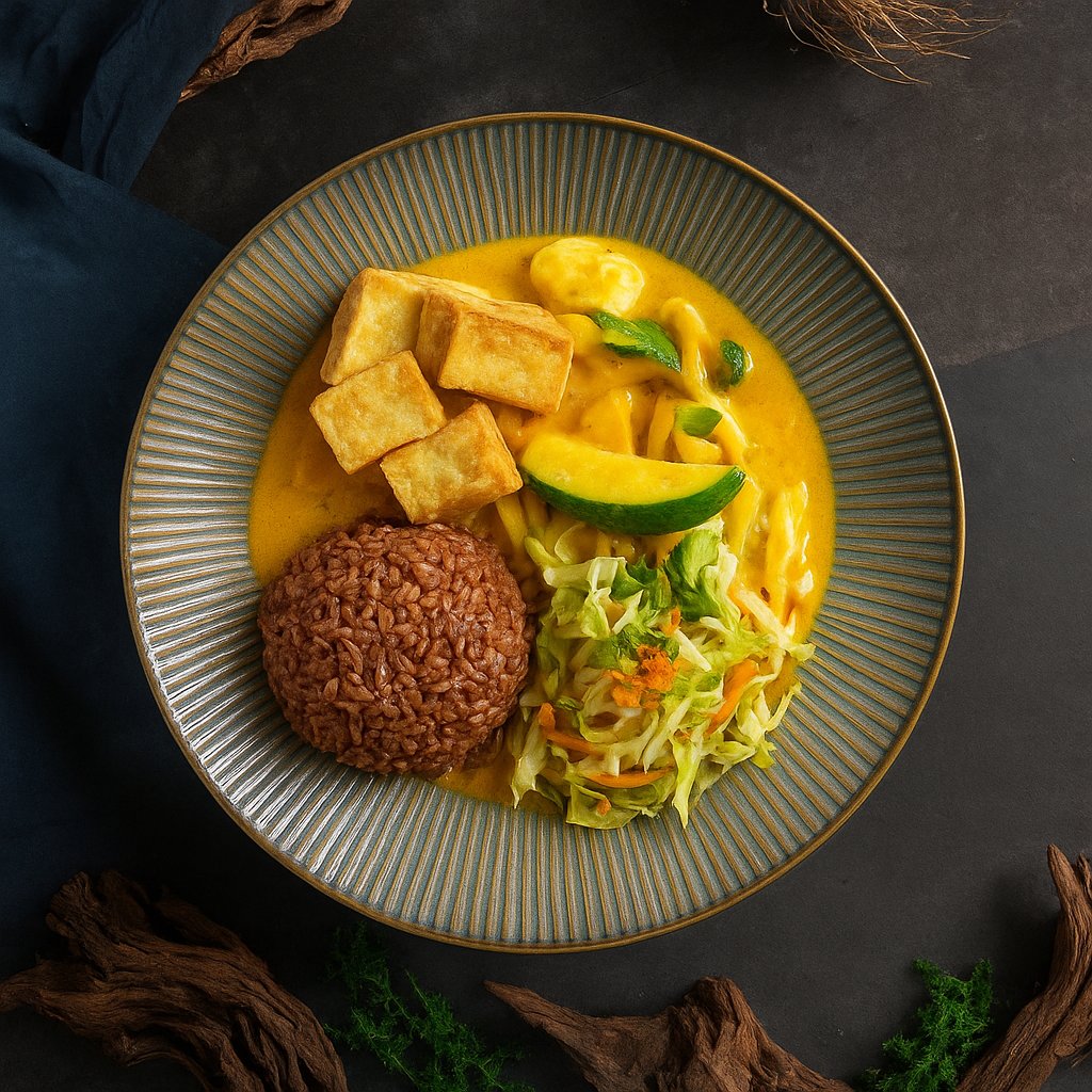 mit Süßkartoffeln, Kürbis, Mix-Gemüse, Pilzen, frischen Kräutern in vietnamesischer Currysoße und mit einer Zutat deiner Wahl