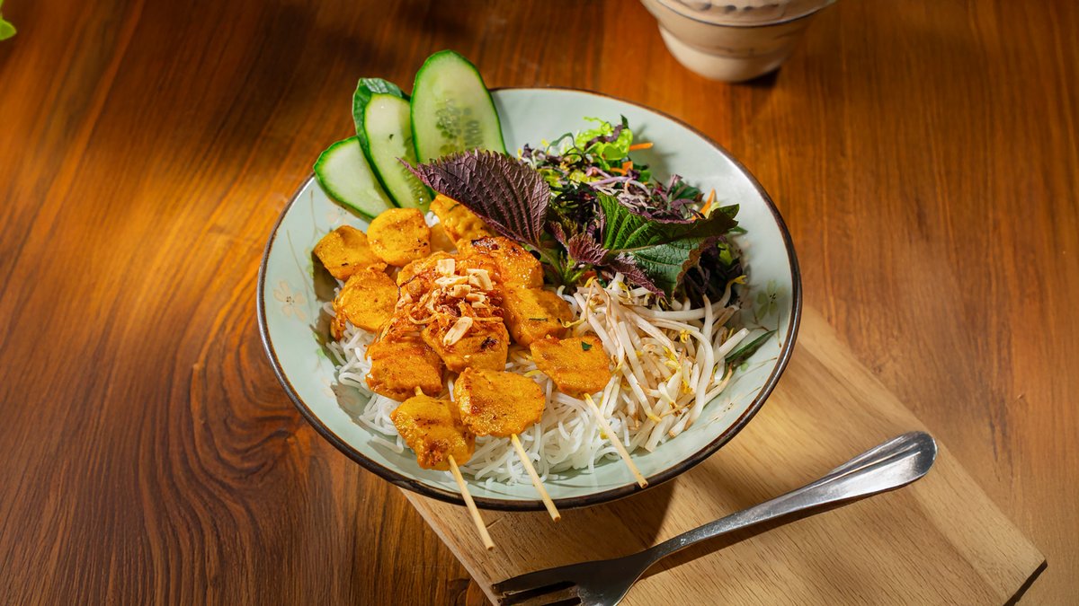 gegrillter hausgemachten Seitan mit feinen Reisnudeln, Salat, Kräutern, Limetten-Dressing, Erdnüssen, sautierten Schalotten und Limetten-Sojasoße