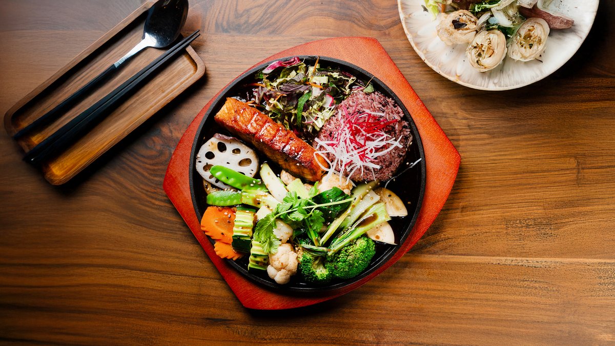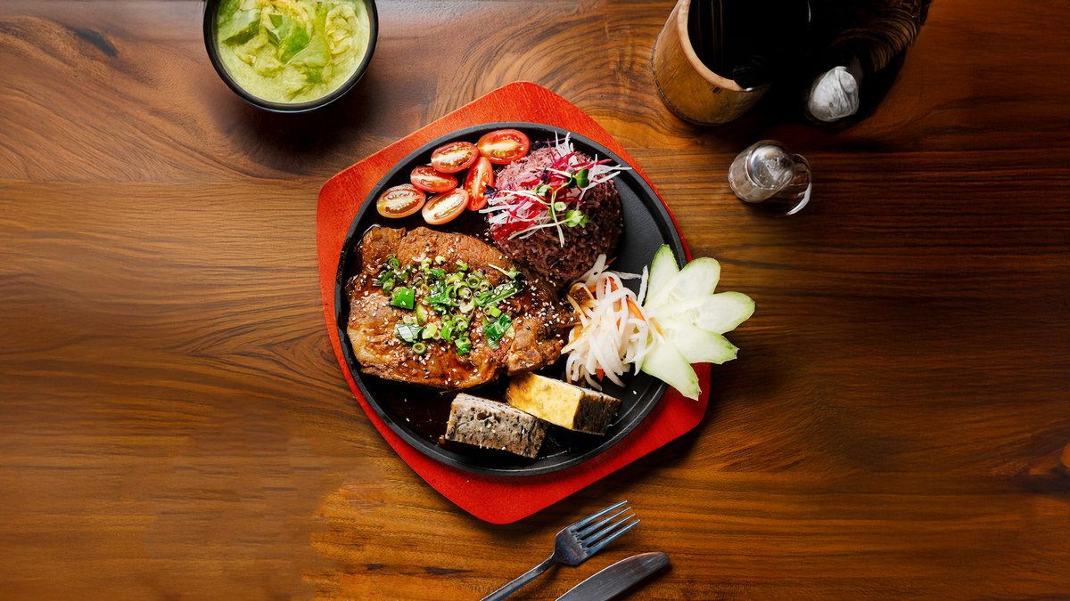 gemischter Reisteller mit warmem Reis, gegrilltem marinierten Schweinesteak, gedämpfter Shiitake-Quiche, sautierten Frühlingzwiebeln, eingeletem Wurzelgemüse und Limetten-Chilisoße