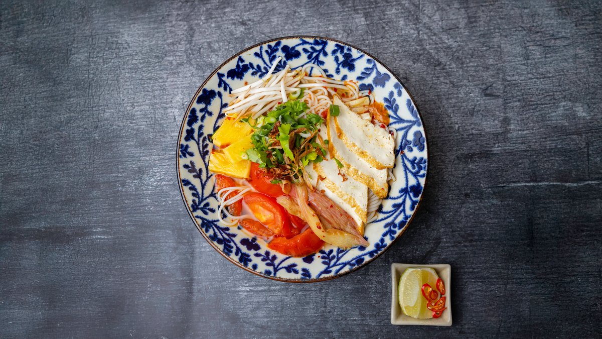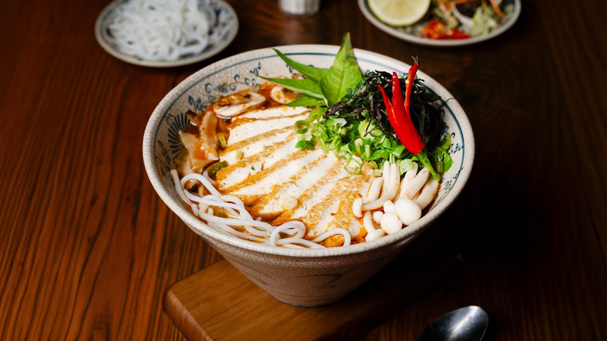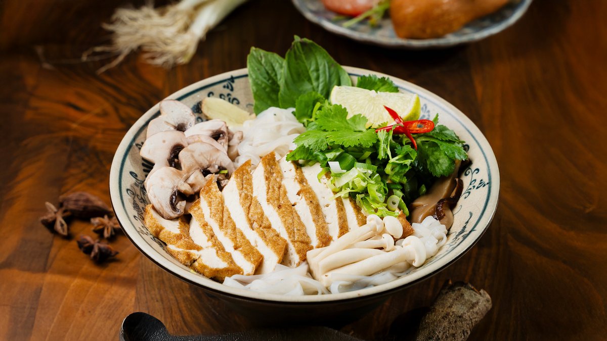 frische Reisbandnudeln in einer traditionell gewürzten Brühe mit Tofu, Shimeji und frischen Kräutern
