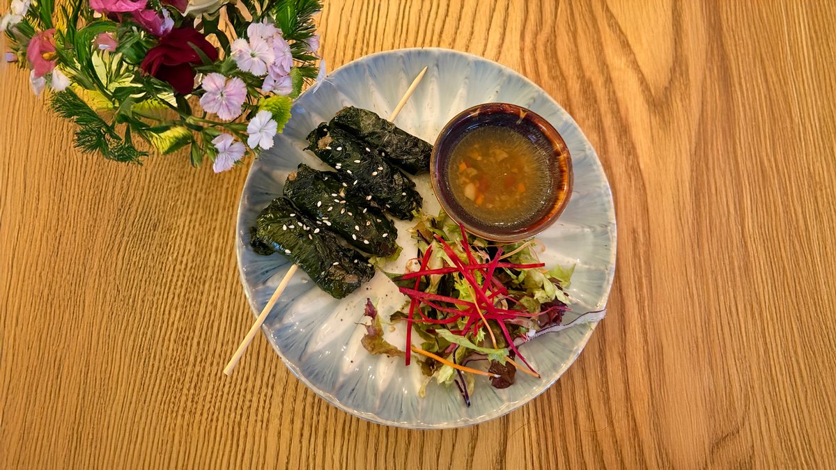 knusprige Reispapierrollen mit Taro, Beluga Linsen, Shiitakes, Limetten-Sojasoße und frischen Kräutern