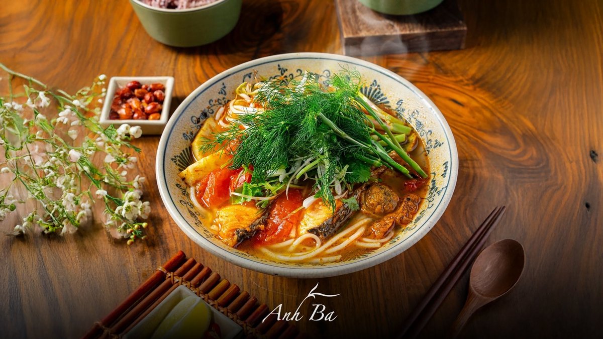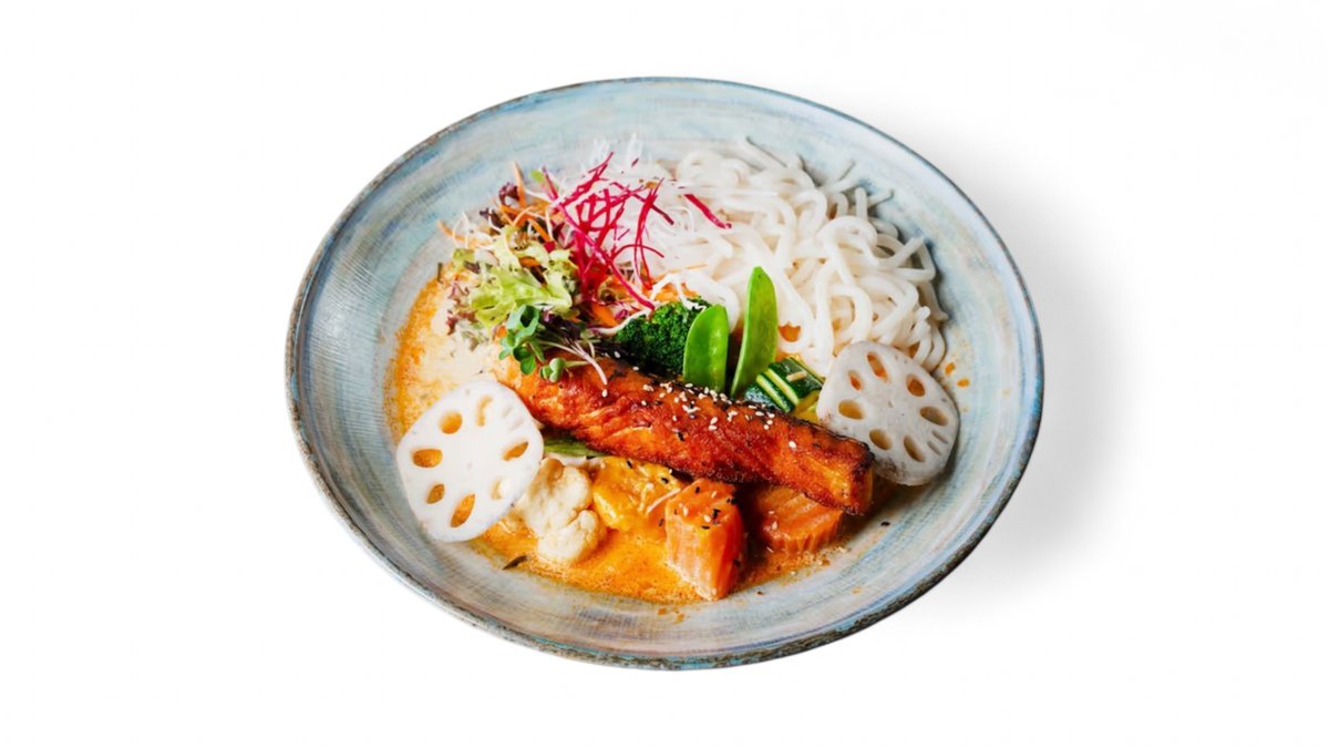 leicht scharf feine Reisbandnudeln mit Lachs, hausgemachten Fisch-Patties in fruchtiger aromatischer Brühe, Koriander, Lauchzwiebeln und frischem Dill