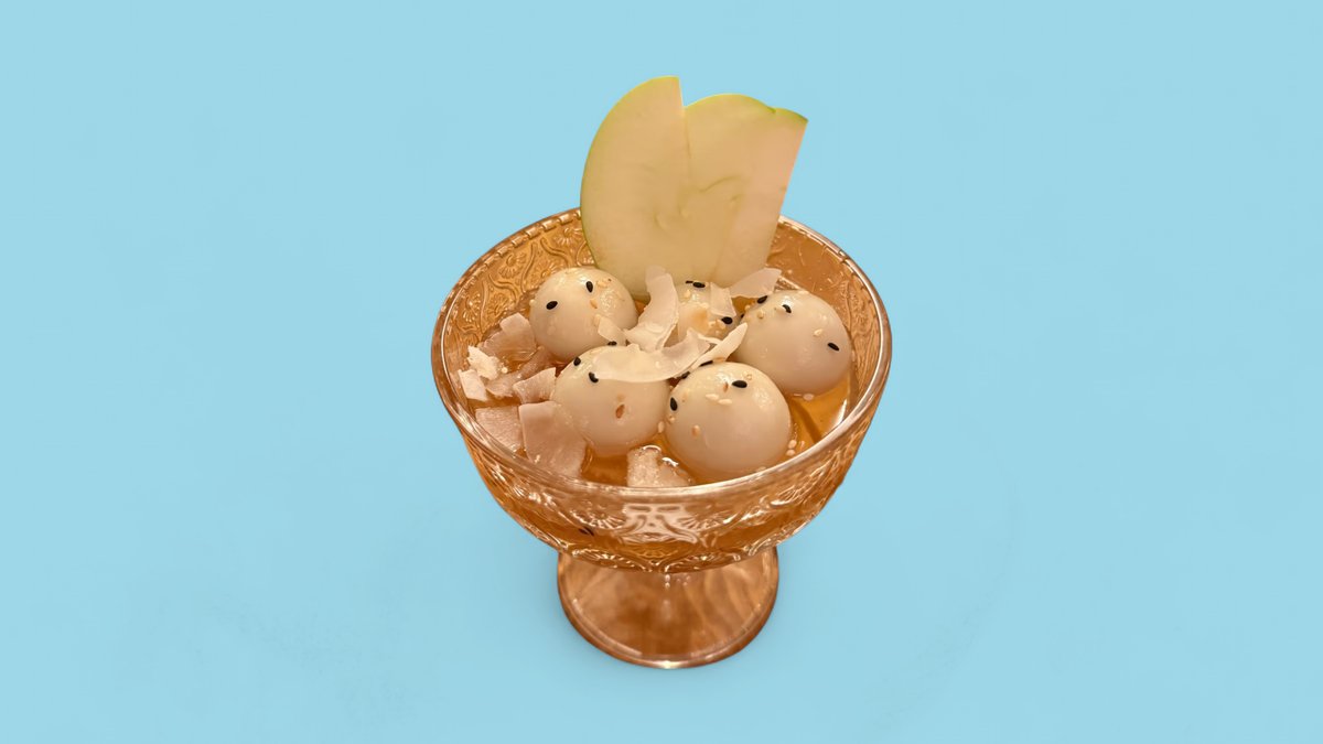 hausgemacht, warm Mochi-Klebreisbällchen mit Sesam-Rote Bohnen-Füllung in Ingwer-Palmzucker-Bad