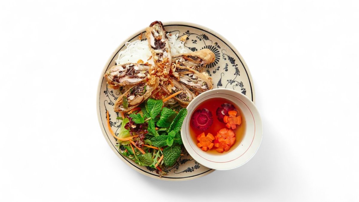 Reispapierrollen mit Hähnchen, Taro, Beluga Linsen, Shiitakes, Limetten-Sojasoße und frischen Kräutern
