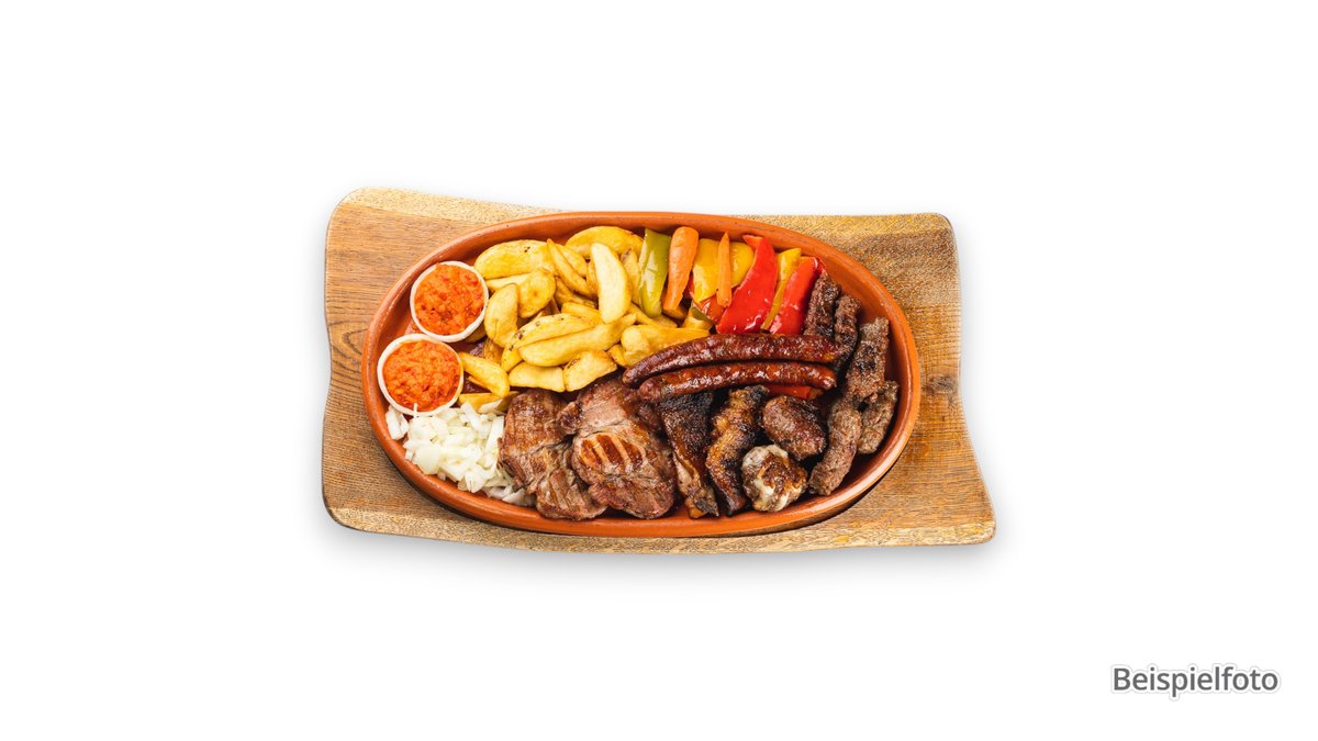 pikant gegrilltes Lammfleisch mit Ingwer, Paprika, Champignons und Zwiebeln in pikanter Soße