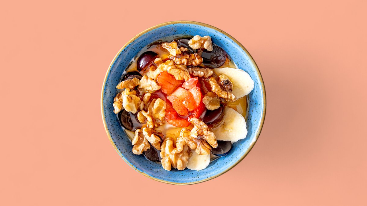 griechischer Joghurt mit frischen Früchten, Walnüssen und Honig