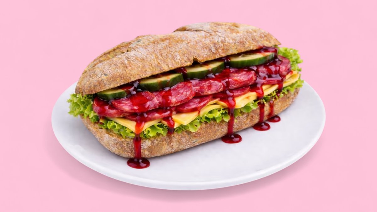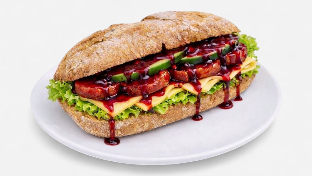 special baguette with tomatoes, cucumbers, salad, remoulade, sucuk, Gouda cheese and Garanat apple sauce