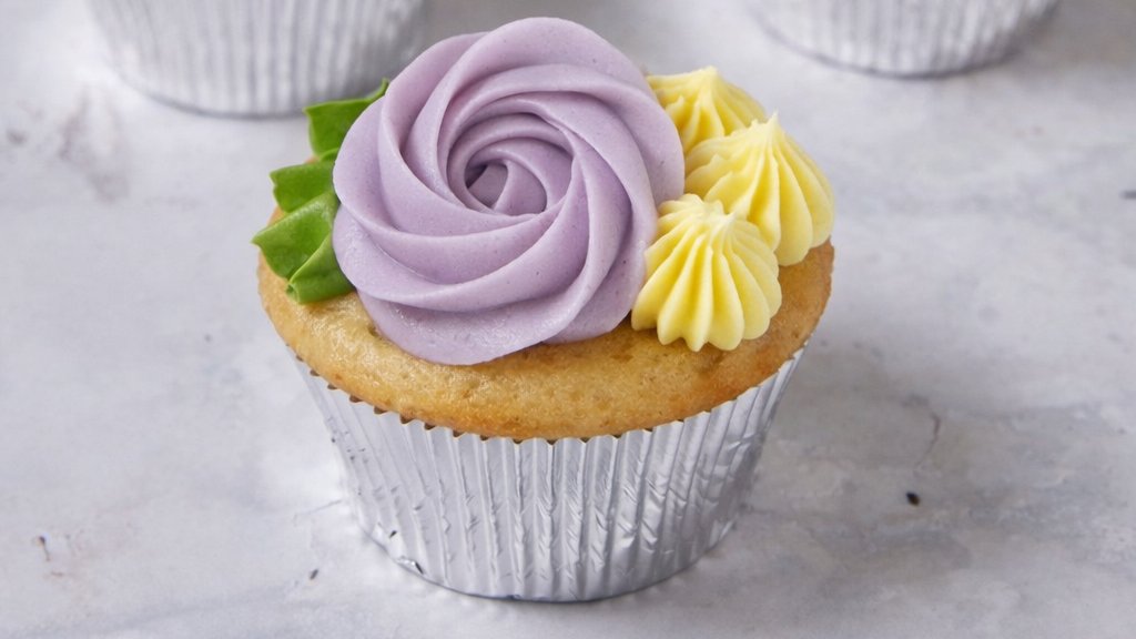 Almond Lemon Cupcakes with Lavender Frosting A wonderful vegan almond cupcake, filled with silky lemon curd and finished with delicate lavender frosting – a harmonious flavor experience, completely free from animal products. The floral decoration made from lavender frosting features a large rosette, complemented by small yellow accents and fine green leaves, all carefully hand-piped.