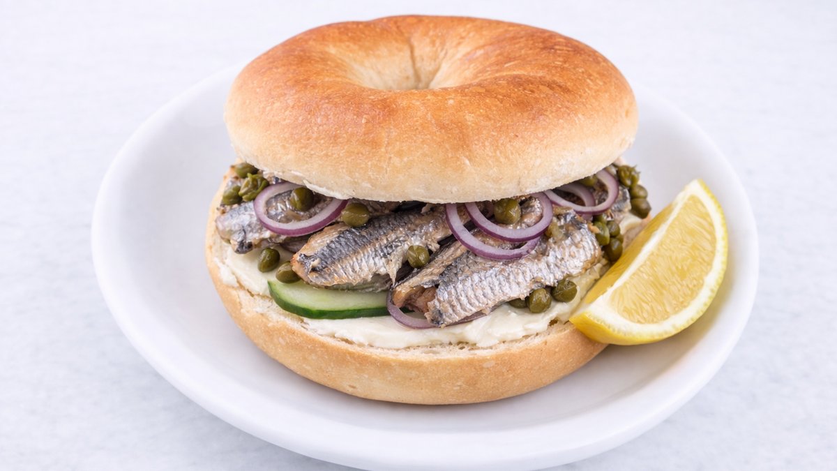 With French sardines from certified organic farming, plain cream cheese, red onions, cucumber, capers & a fresh lemon wedge