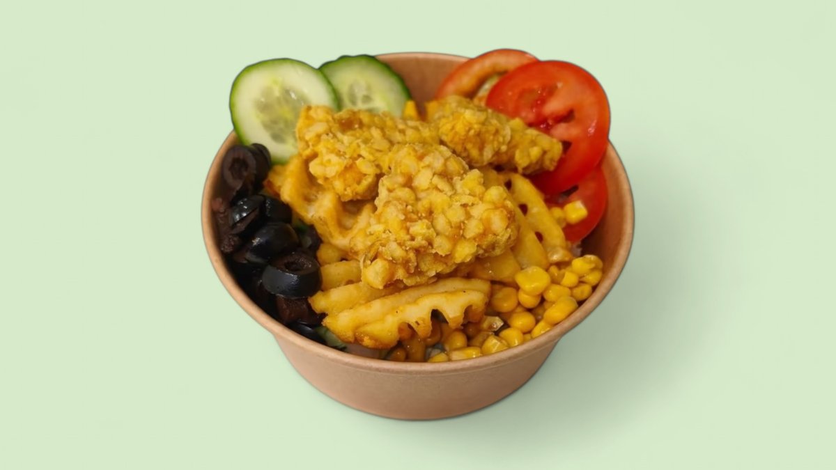 Chicken, Fries, Eisberg, Tomaten, Gurken, Oliven, Mais und Sauce.