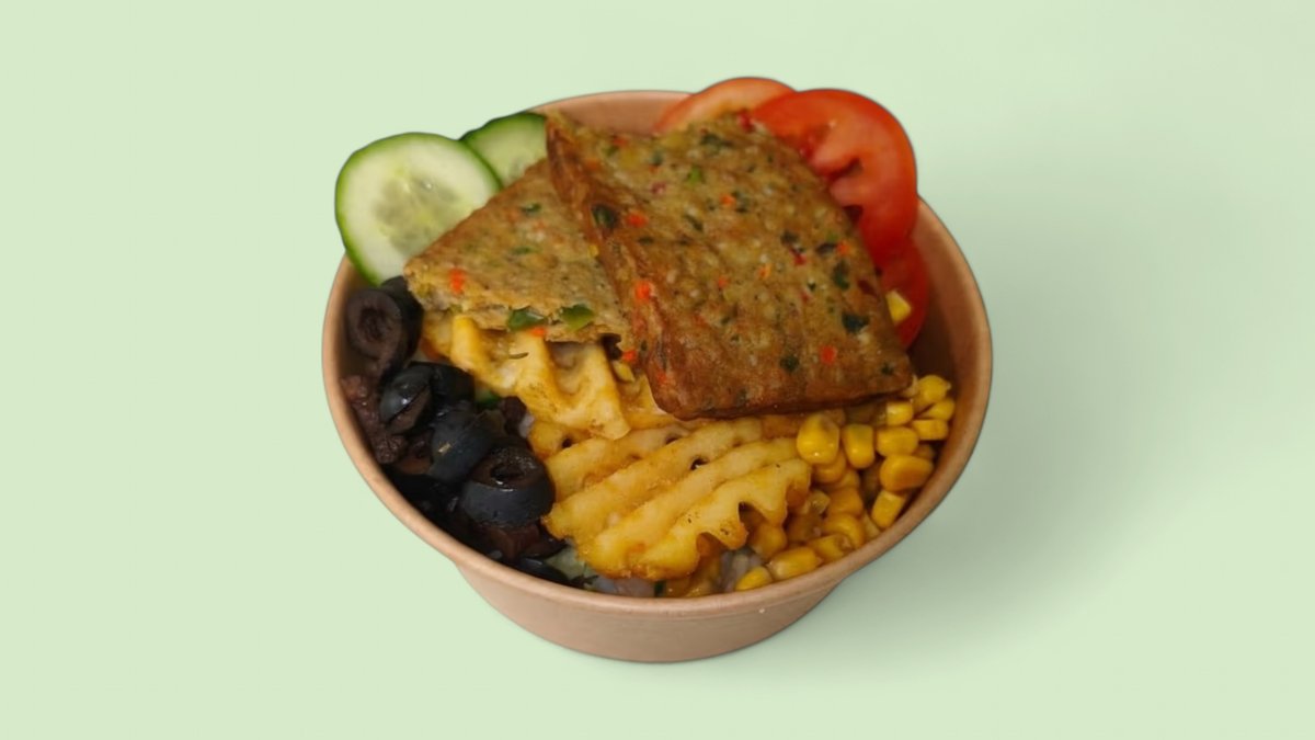 Vegan Fleisch, Fries, Eisberg, Tomaten, Gurken, Oliven, Mais und Sauce.