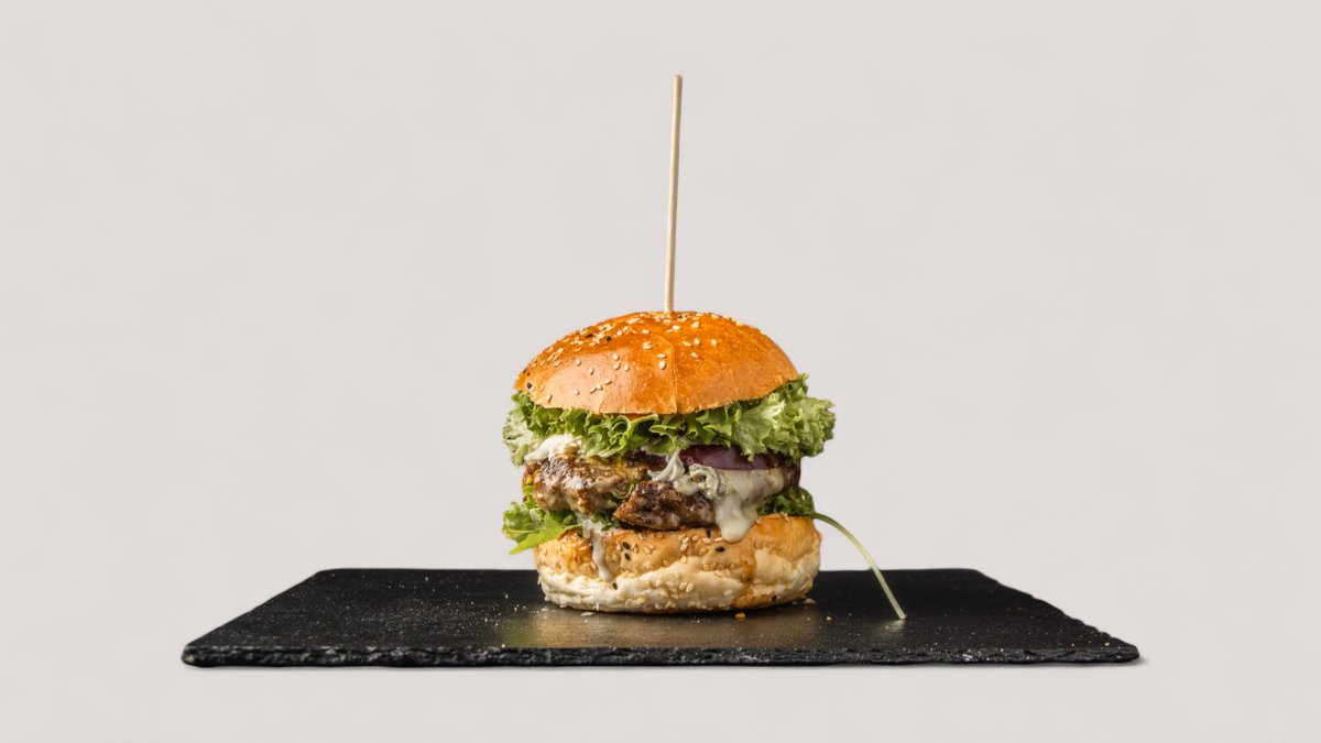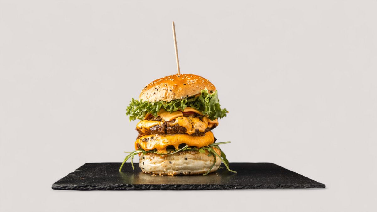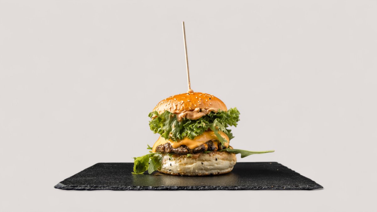 mit doppeltem Rindfleisch, Zwiebeln, Rucola und Cocktailsoße