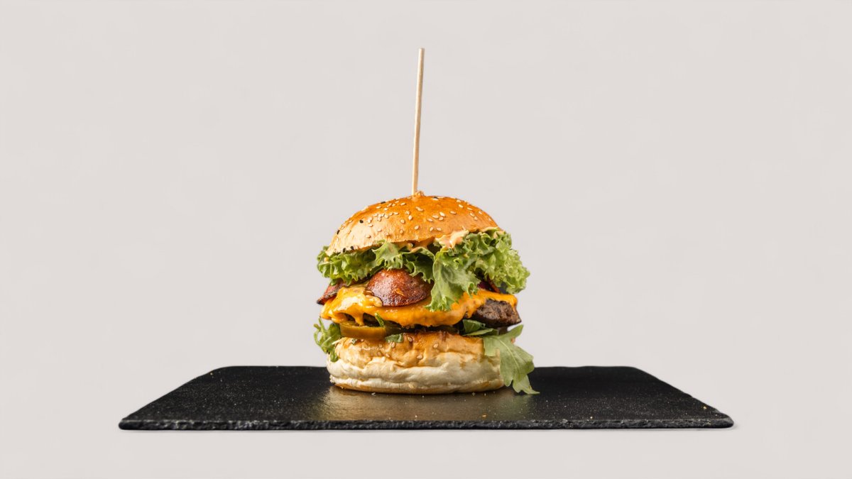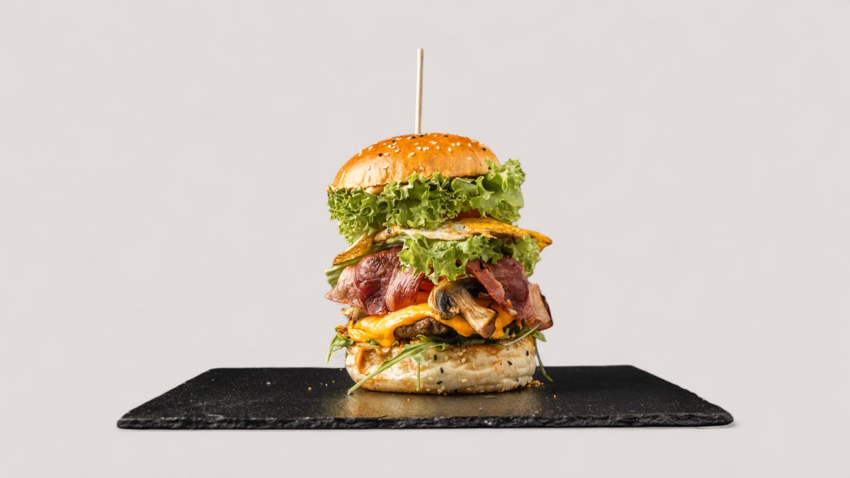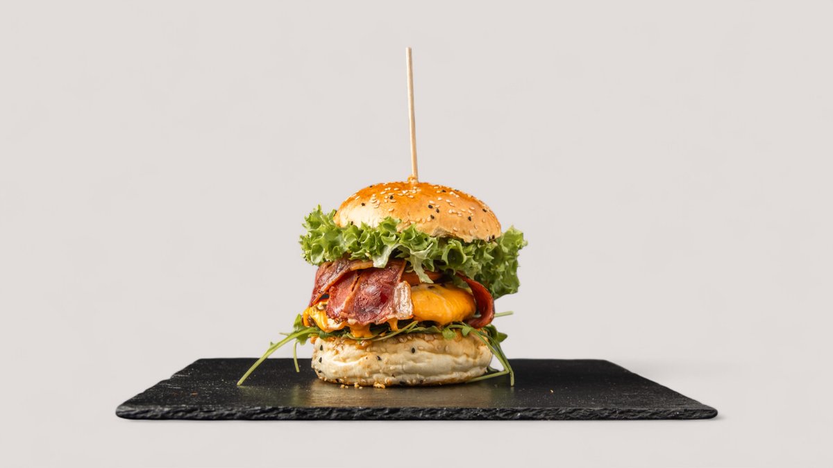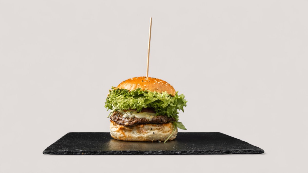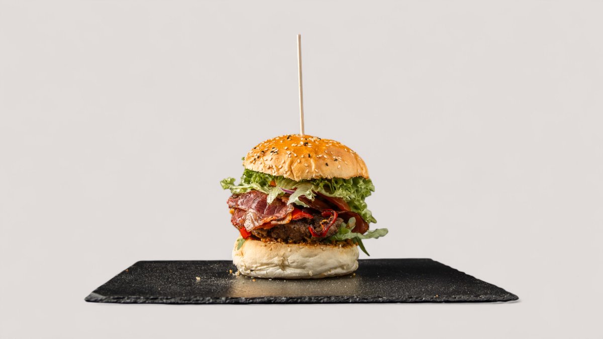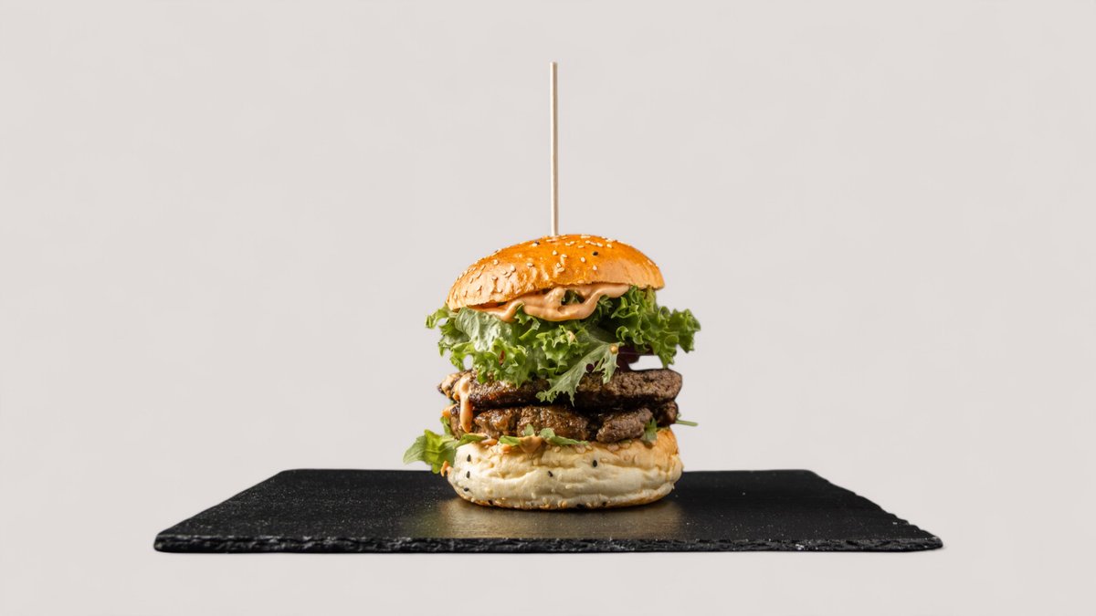 alle Burger werden mit 185 g Rindfleisch und frischen knackigen Lollo Bionda, sauren Gurken, Tomaten, roten Zwiebeln und Rucola zubereitet, Alle unsere beliebten Burger werden mit 185g bestes 100prozentigen Rindfleisch, knackigen Lollo Bionda, sauren Gurken, Tomaten, roten Zwiebeln und Rucola zubereitet, darauf kommt unsere berühmte hausgemachte Soße zwischen einem veganen Sesambrötchen