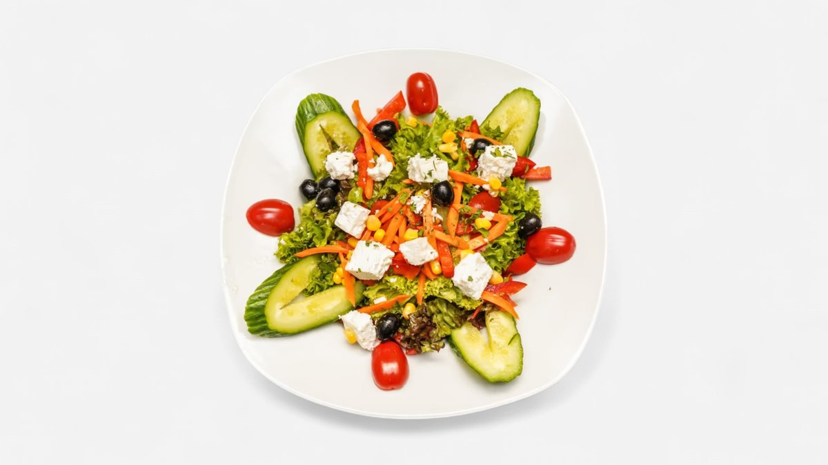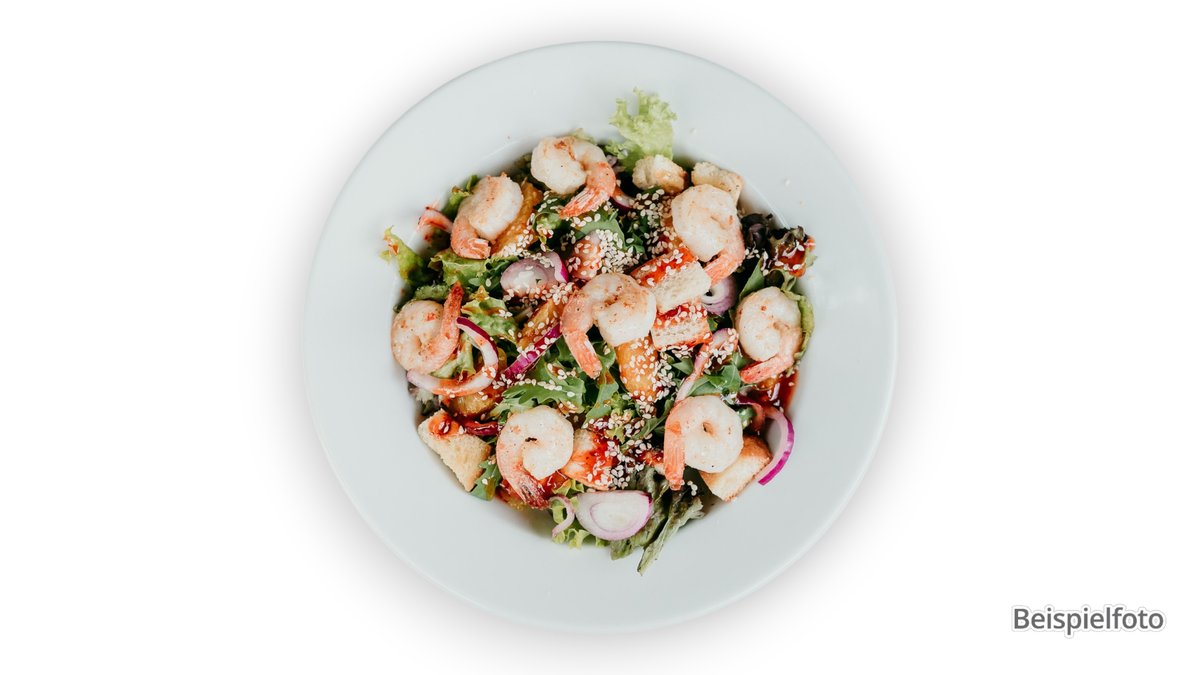 gemischter Salat mit Zwiebeln, Knoblauch und Scampi