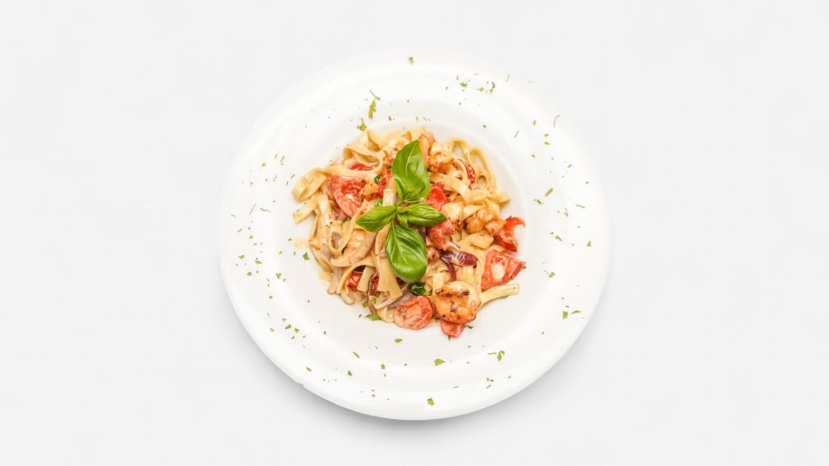 mit scharfer Paprika, Knoblauch, Kirschtomaten, Zwiebeln, Basilikum und Scampi