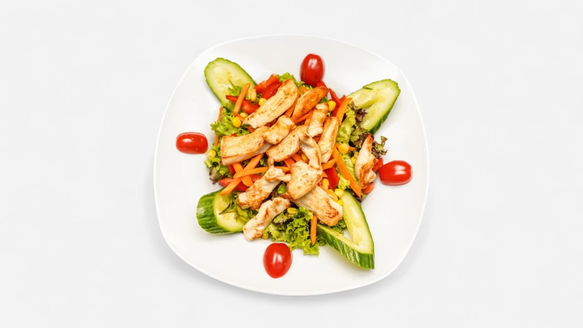 gemischter Salat mit Zwiebeln und Hähnchenfleisch