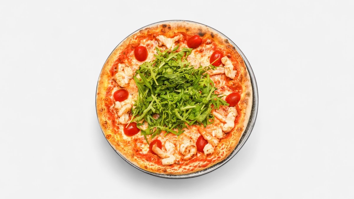 mit Garnelen, Rucola, Kirschtomaten und Knoblauch
