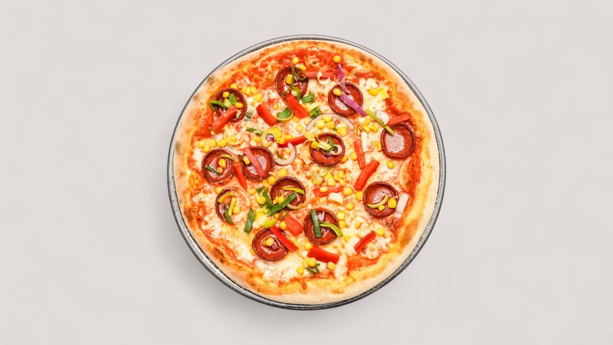 mit Knoblauchwurst vom Rind, Käse, Zwiebeln, Paprika und Mais