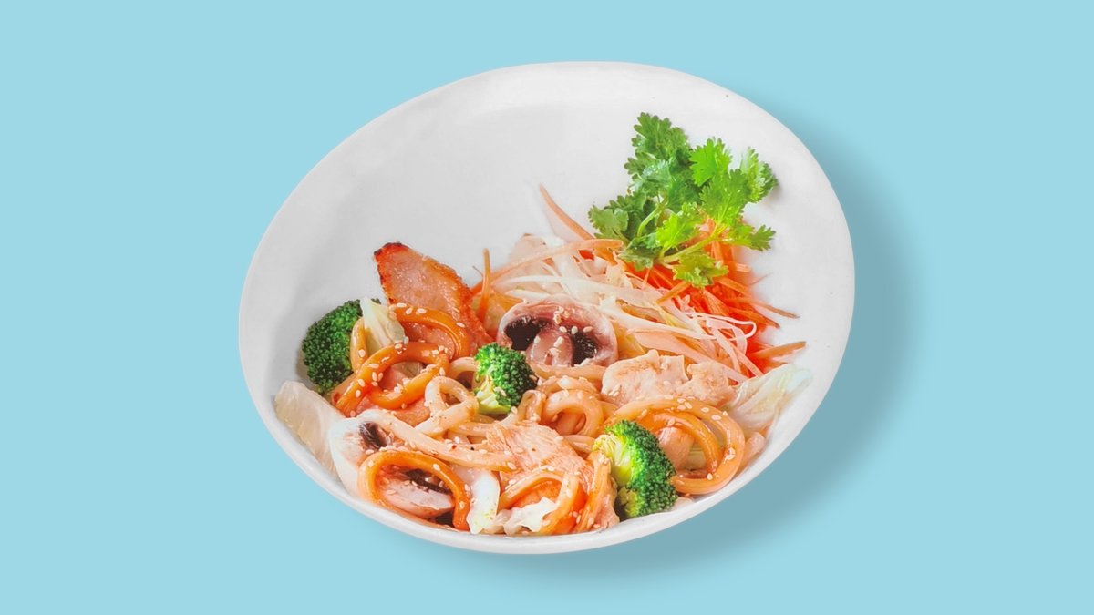 gebratene Udon-Nudeln mit buntem Gemüse in Soja-Teriyaki-Soße, frischem Ingwer, Sesamkörnern, einer Zutat und einer Beilage deiner Wahl