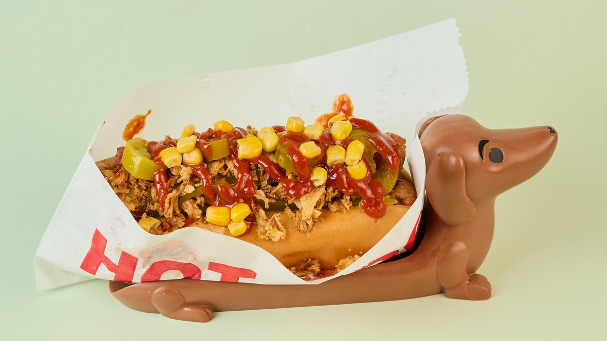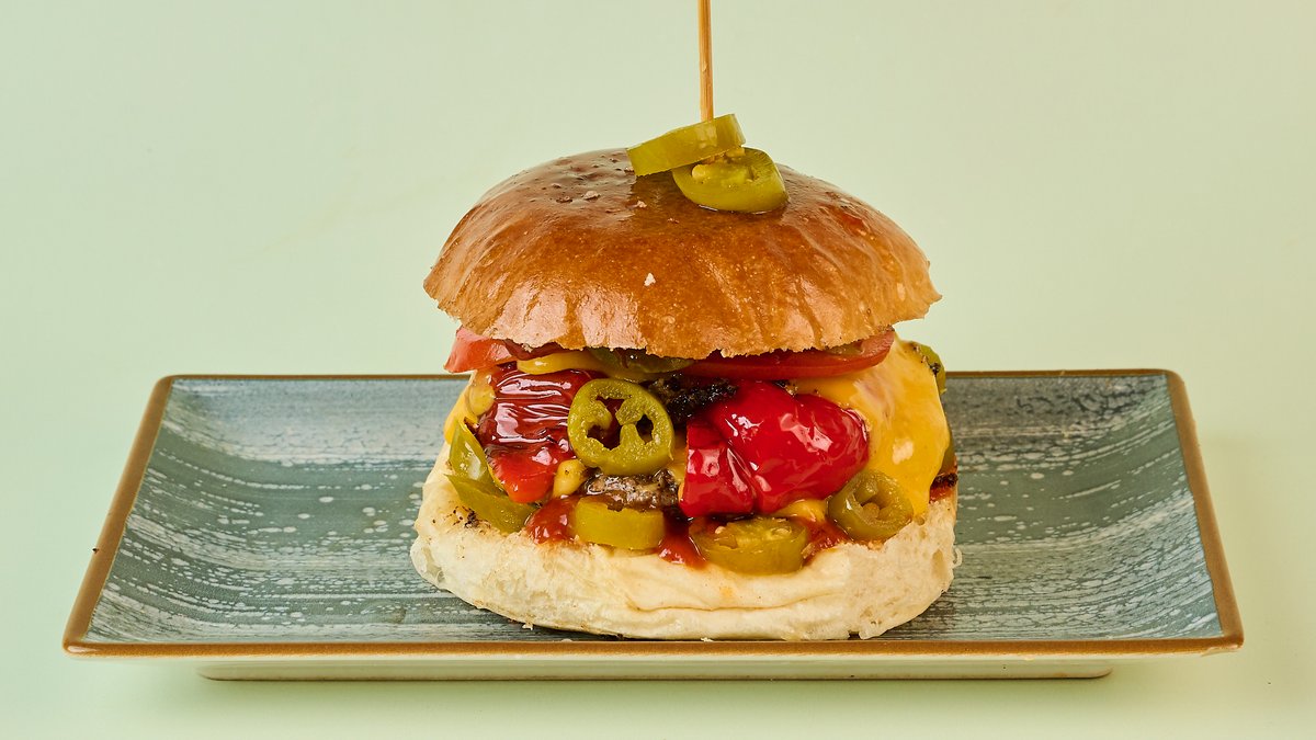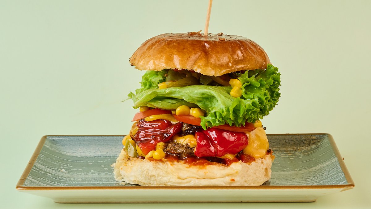 with 150 g beef patty, cheese sauce, hot peppers, corn, vegetables, salad and bougie sauce