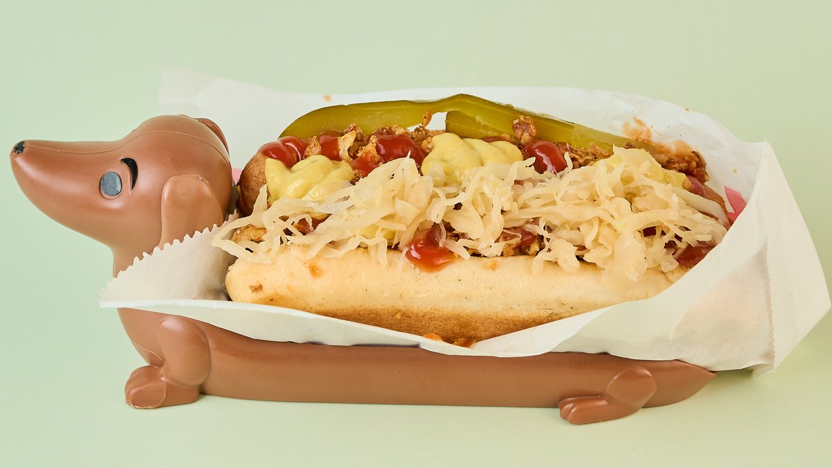 with gherkins, fried onions, cheese, bougie sauce and sauerkraut