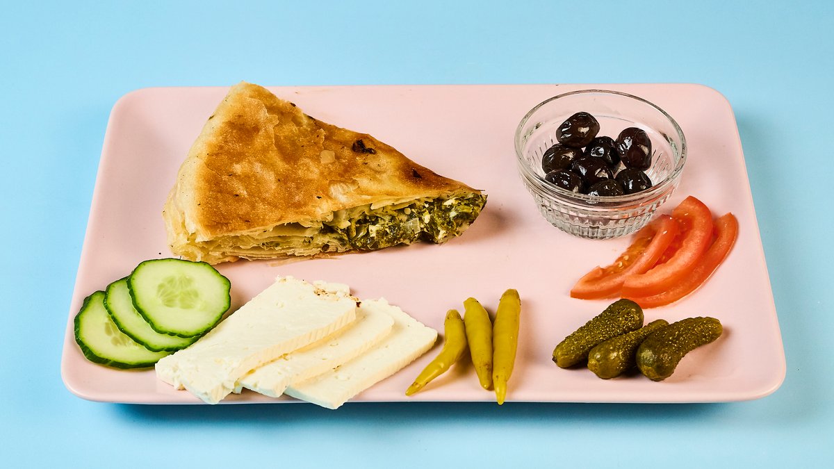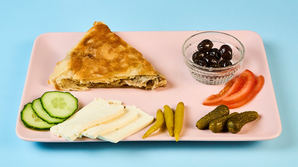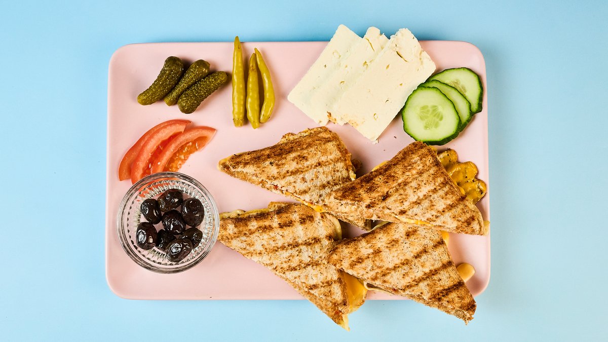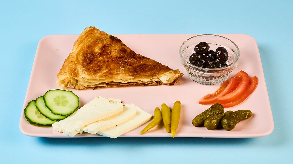 Butter, Tomatenmark, Philadelphia, Gouda & als Beilage Oliven, türkischer Schafskäse, Cornichons, Peperoni