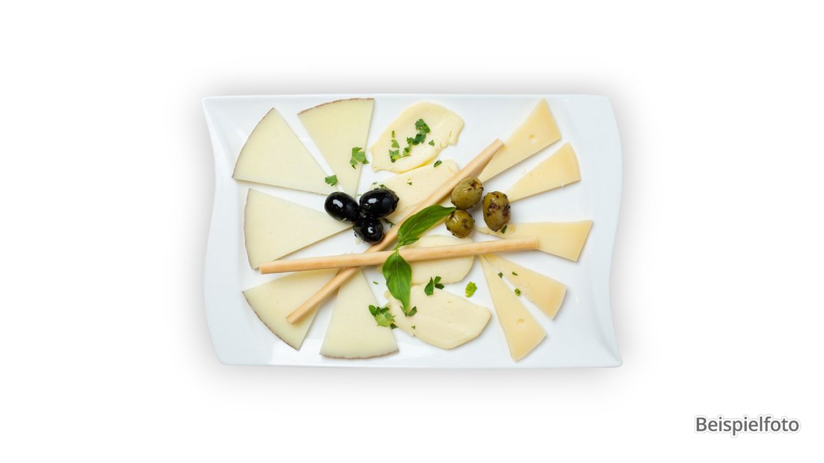 with four different types of cheese, olives, chili peppers and a bread basket