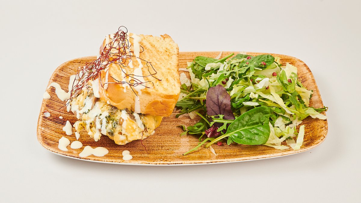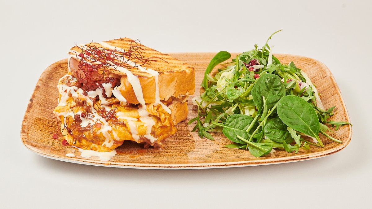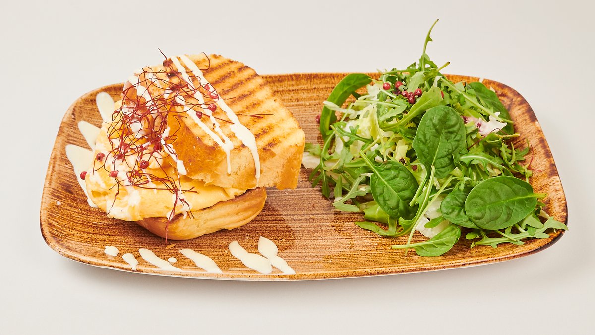 alle Gerichte sind Rührei auf getoasteter Brioche mit Schmelzkäse und Salat, außer Pasta und Granola