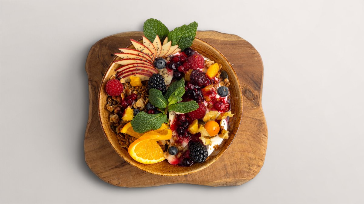 Joghurt, Saisonfrüchte und Müsli