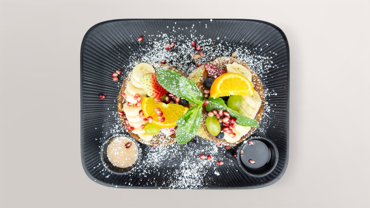 2x fluffige Pfannkuchen mit frischen Blaubeeren, Bananen, Karamellsoße und Ahornsirup