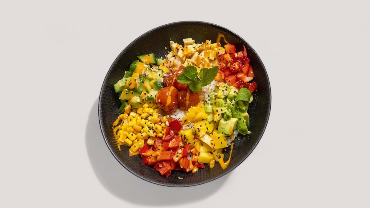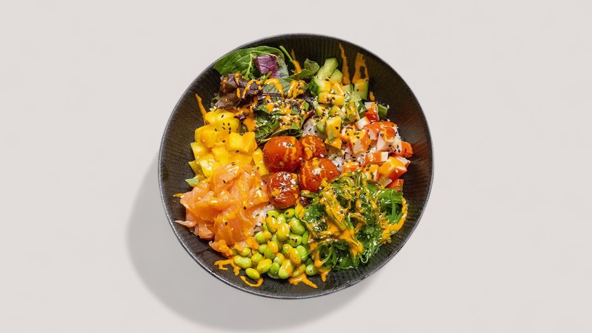 Salmon, surimi, roasted tomatoes, edamame, fresh salad, fresh fruits, topped with sesame and roasted onions, with premium sushi rice.