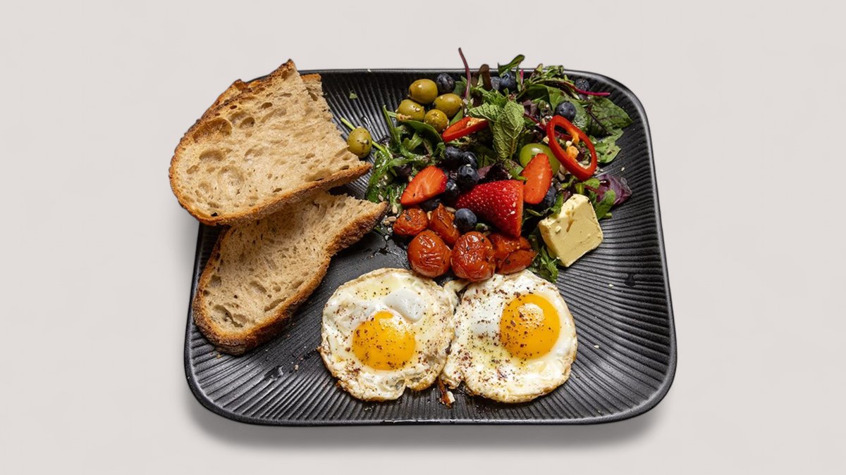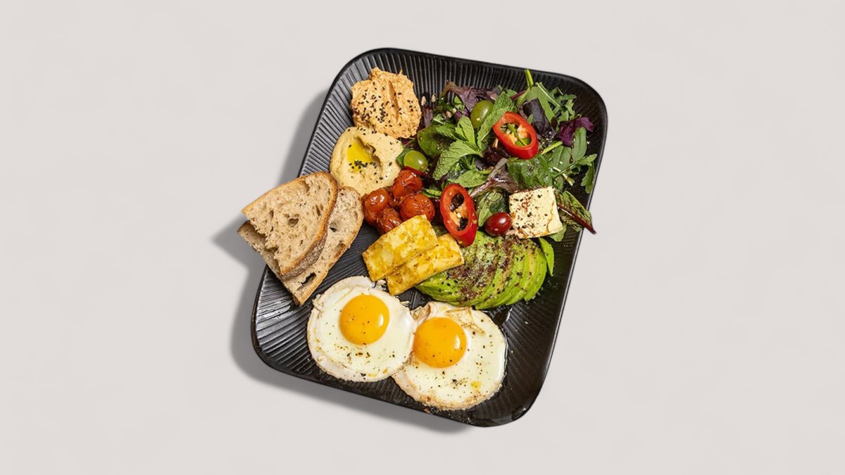 2x Spiegeleier mit Grillkäse, Avocado, gerösteten Tomaten, hausgemachter Tomatencreme, hausgemachtem Hummus, Erdbeermarmelade, Butter, Oliven, Toastbrot und Salat, verfeinert mit frischen Früchten, Sonnenblumenkernen und Zitronenöl, in einer Größe und mit einer Zutat deiner Wahl