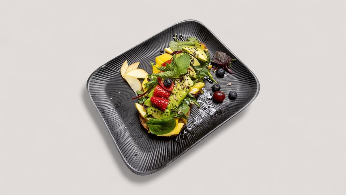 Sauerteigbrot mit zerdrückter Avocado, Mango und frischem Salat, verfeinert mit frischen Früchten, Sonnenblumenkernen, Walnusskernen und Zitronenöl